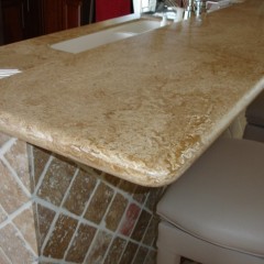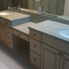 2″ thick full bullnose Corian Aurora Countertops on Maple spice Cabinetry. Stainless steel undermount sink.